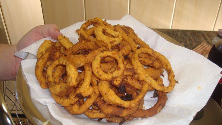 Mergulhe os anéis no óleo para fritar por 2 a 3 minutos, até ficarem dourados.