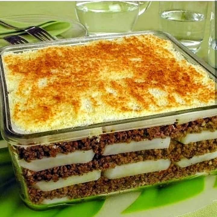 Misture a salsa e reserve. Em um refratário médio, intercale camadas de batata e de carne. terminando em batata.