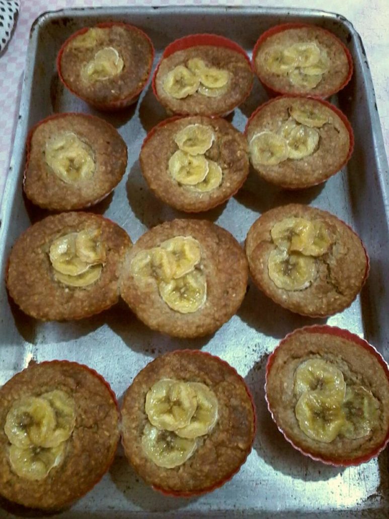 Receita: No liquidificador 3 ovos, 4 bananas, 2 colheres de óleo. Bater bem e colocar 2 xícaras de aveia de flocos médios e 1 colher de fermento de bolo. Assar por 25 min, forno médio.