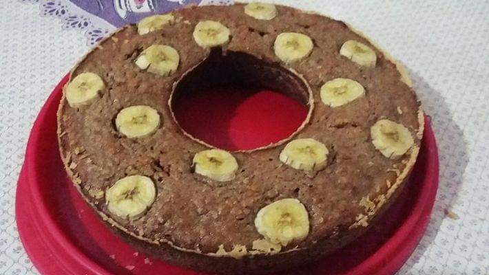 Despeje em uma forma untada, decore com banana, salpique canela e leve para assar.
