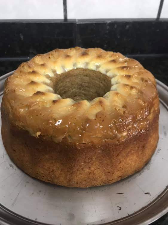 Unte uma forma com bastante margarina coloca uma lata ou caixinha de leite condensado despeja a massa e leve para assar forno temperatura 180 graus por 40, 45 minutos!
