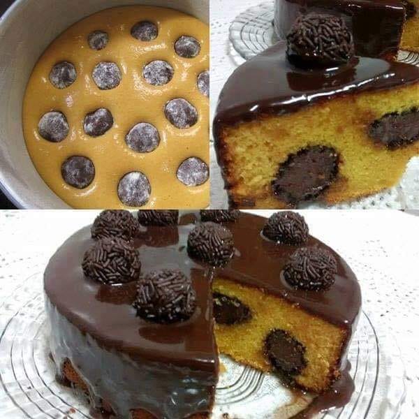 Desenformar com o topo do bolo virado para baixo do prato (para esconder os buracos dos brigadeiros)