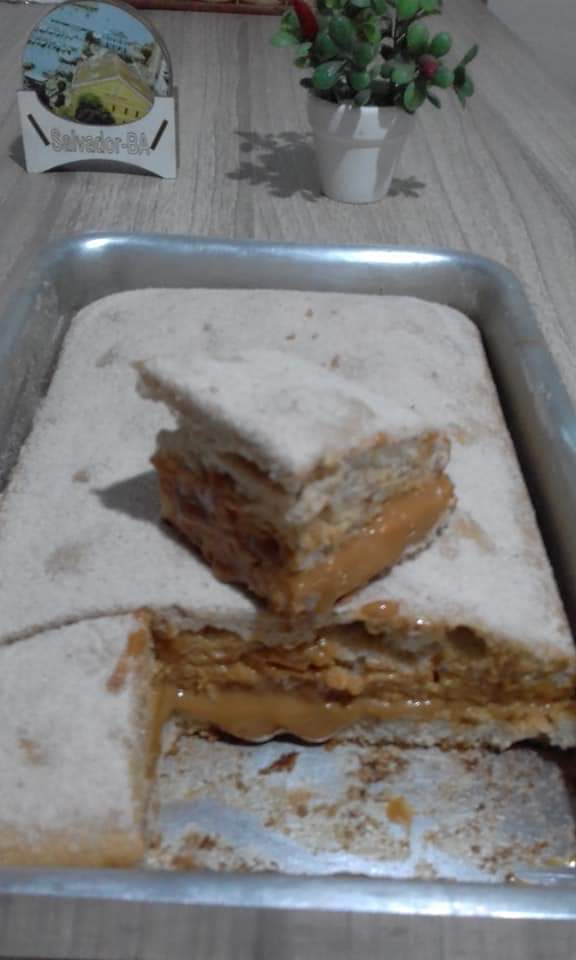 Coloca o recheio e cubra com a outra parte do bolo depois joga açúcar com canela em cima ????