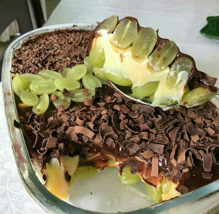 Em uma travessa coloque todas as uvas já lavadas no fundo, jogue o creme branco por cima e logo em seguida adicione a ganache, deixe na geladeira por 20 minutos.