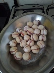 Ingredientes 100 gramas de açúcar 250 gramas de farinha 150 de margarina ou manteiga sem sal. Recheio: Goiabada ou doce de leite”MuMu” Misture tudo até ficar uma massa depois faça as bolinhas e assa em forno pré aquecido a 180°graus. Por 15 minutos, deixe esfriar e recheie com MuMu, ou goiabada derretida mas fria e …