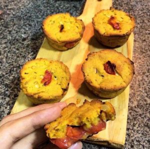 Ingredientes – 1 xícara de batata doce cozida e amassada– 1 xícara de farinha de aveia– 1/4 xícara de azeite– 1/2 cebola picada bem pequenininha– 1 colher de sopa de vinagre de maçã– 1 colher de sobremesa de fermente em pó– Sal e temperos a gosto (usei cúrcuma, levedura nutricional, alho em flocos, páprica defumada …