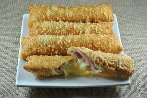Coloque uma tira presunto e uma de mussarela;