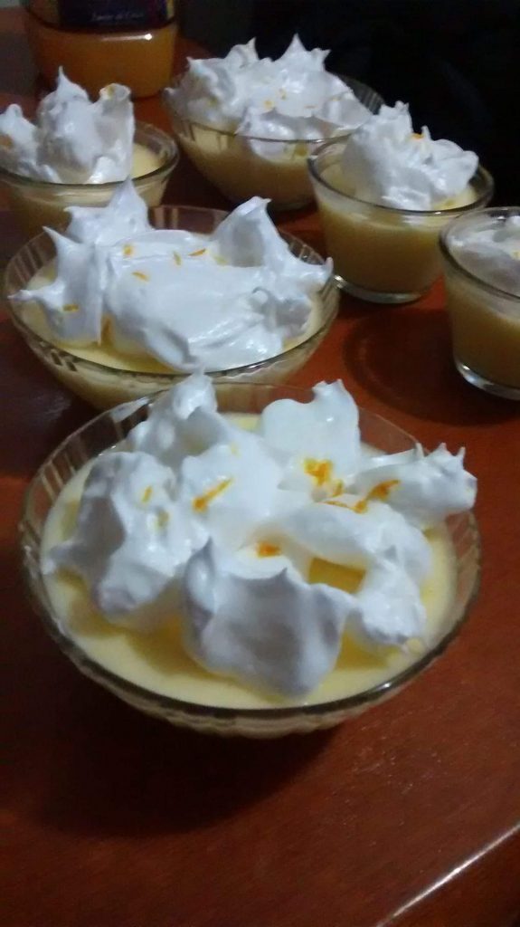 Com as gemas e o açúcar faça uma gemada, após misture o suco de laranja com a maisena desmanchada.