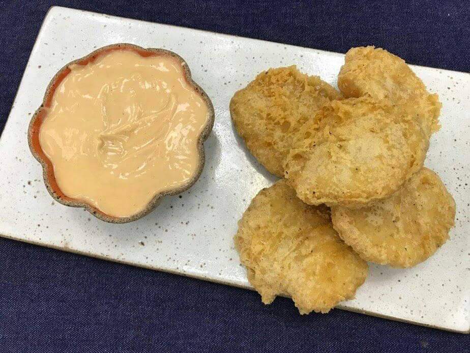 - Com as mãos untadas com óleo, pegue pequenas porções do frango processado (+/- 30g) e modele no formato de discos. Leve ao freezer por +/- 1 hora ou até firmar. Reserve.