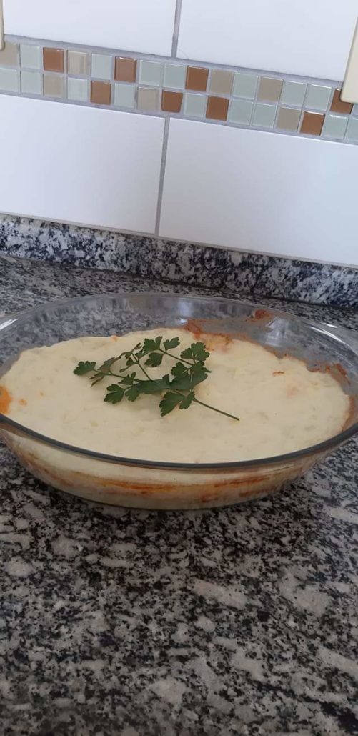 Primeira camada purê depois uma com o molho de frango e uma de mussarela última camada de purê, leve ao forno para gratinar