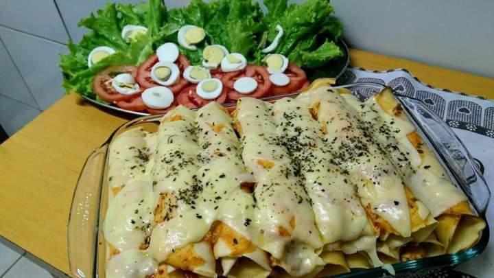 3 xícaras d farinha, um copo americano d leite,dois ovos,sal a gosto bate tudo no liquidificador, recheio um peito d frango umas 800 grama mais ou menos desfiado,uma cebola,um tomate, meio pimentão vermelho um sazon (uso sabor nordeste pacote bordô),meia colher d extrato d tomate pronto !! Faço molho d frango recheio elas e quando tá tudo montado ponho queijo mussarela por cima e orégano e levo ao forno por uns 15 min em fogo médio !!! Sirva com saladas diversas ????????????????