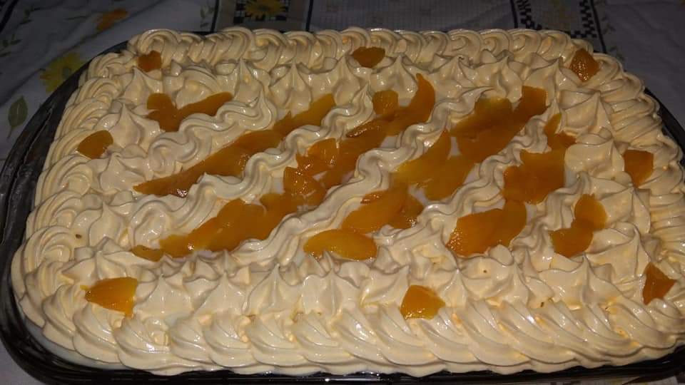 Use o caldo do pessego para molhar as bolachas,pique os pessegos e começe a montar creme,bolachas e pessegos camadas por camadas.