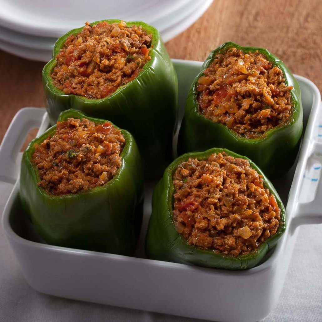 Comece lavando bem os pimentões em água corrente. Depois corte as pontas do pimentão e deixe-os em forma de “copo”, retire as fibras brancas e sementes. Reserve. Prepare o recheio refogando o alho e cebolas, em seguida junte a carne e refogue bem. Acrescente os tomates, azeitonas e temperos. Ao estar tudo bem misturado e consistente, recheie os pimentões. Coloque em assadeira untada e leve ao forno previamente aquecido por 20 minutos. Retire e sirva.
