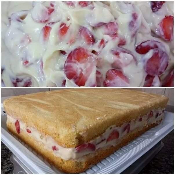 10 ovos 10 colheres de açúcar 10. Colher de farinha,bater os ovos com o açúcar ,e quando estiver bem batido acrescentar aos poucos a farinha. obs.OS Morangos são a gosto pode colocar quantas cx quiser