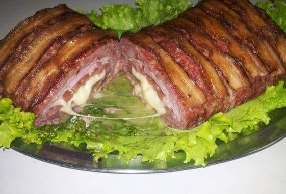 Enrolar como um rocambole e dispor as fatias de bacon por cima. Dispor em uma assadeira e levar ao forno preaquecido 180 graus por 1 hora. Pincelar com geleia de pimenta e servir.