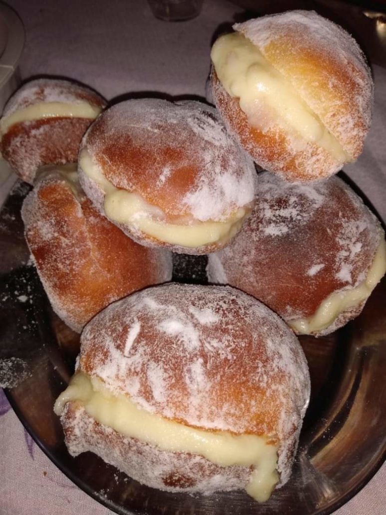 2x de leite morno 8 colheres de açúcar 1 pitada de sal 3 colheres de manteiga 2 gemas 1 pacotinho de fermento para pão mistura tudo coloca na bacia e acrescenta farinha até o ponto firme que não grude nas mãos ai sove bem até a massa ficar lisa ai faça bolinhas maios ou menos 50g coloque as bolinhas na forma bem separadas deixe crescer até dobrar de volume coloque assar guando estiver amarelinho tire do forno e frite em óleo quente bem rapidinho até ficar dourado deixar esfriar ai pode rechear com doce de leite ou creme de confeiteiro o meu fiz com creme receita 1 leite condensado mesma medida de leite 2 colheres de amido de milho 2 gemas peneiradas 1colher de baunilha 1colher de margarina cozinhei até virar um creme deixei esfriar rechear os sonhos com o creme e passar no açúcar de confeiteiro