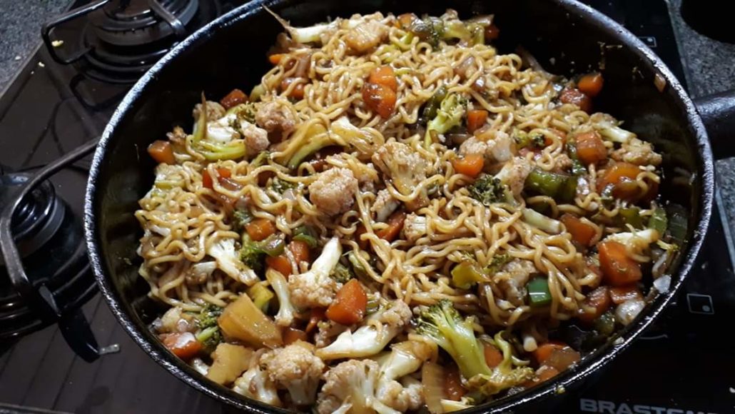 Em uma frigideira grande,refogue os temperos, acrescente os legumes já cozidos com o molho shoyu e depois a massa, refogue ligueirame pra pegar o gosto,obs,coloquei uma pitada de sal,porque o molho já é bem salgado